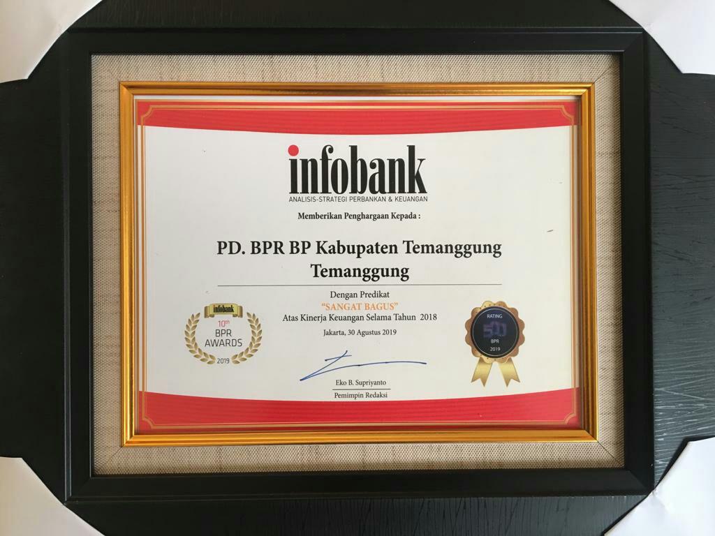 Penghargaan yang diterima oleh PD BPR “Bank Pasar” Kabupaten Temanggung ini merupakan penghargaan yang diberikan oleh Media INFOBANK sebagai bentuk apresiasi bagi BPR atas prestasi dan pencapaian kinerjanya. Dalam Rating BPR Terbaik 2019 (Per Desember 2017 - 2018) PD BPR “Bank Pasar” Kabupaten Temanggung menempati posisi nomor 7 untuk kategori BPR Beraset Rp 250 Milyar sampai dengan dibawah Rp 500 Milyar