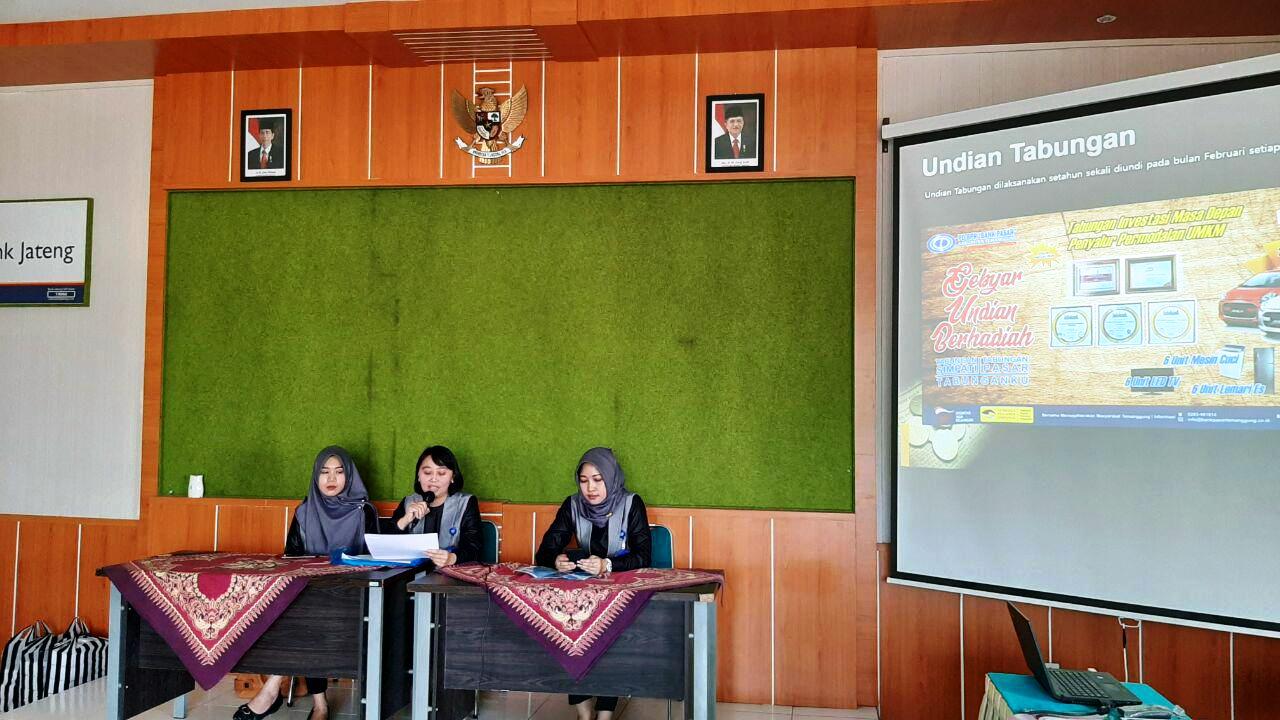 Pada acara sosialisasi tersebut dijelaskan tentang beberapa Produk Tabungan Unggulan PD BANK PASAR TEMANGGUNG yaitu Tabungan BERENCANA (TABERNA), Tabungan SIMPATI, Tabungan PASAR dan Tabunganku serta tidak ketinggalan Produk DEPOSITO yang sangat menguntungkan dan aman karena dijamin oleh pemerintah melalui LPS. Dilanjutkan penjelasan tentang Produk Kredit yaitu Kredit untuk Pegawai dan Kredit UMKM. Selain itu juga menginformasikan bahwa pada bulan Februari 2020 PD BPR BANK PASAR TEMANGGUNG akan mengadakan Event GEBYAR UNDIAN BERHADIAH Tabungan SIMPATI, Tabungan PASAR dan Tabunganku.