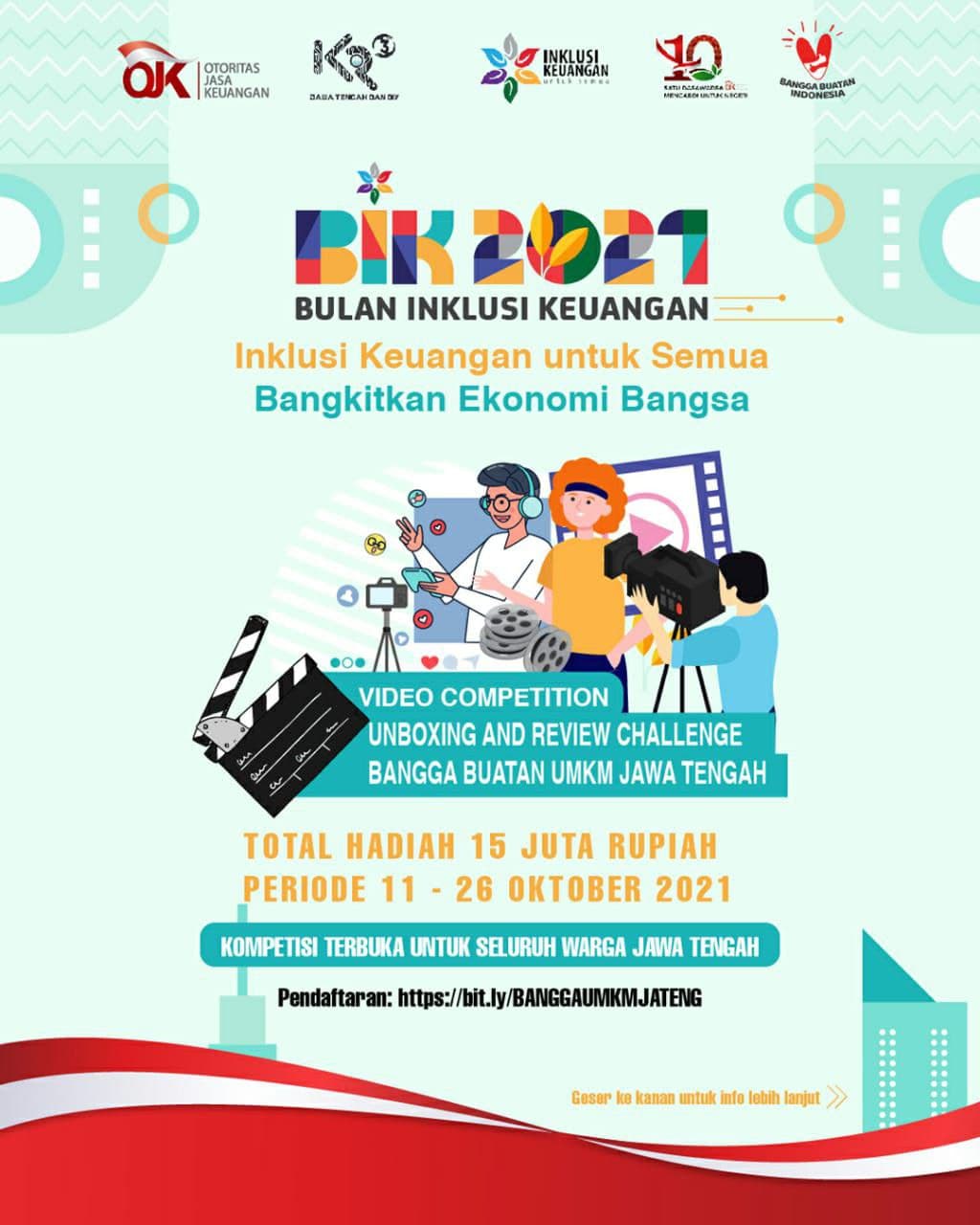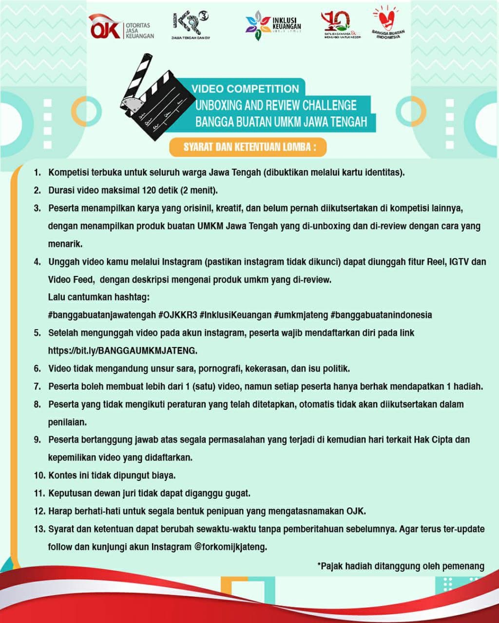 Dalam rangka pelaksanaan kegiatan Bulan Inklusi Keuangan dan mengakselerasi pemulihan ekonomi serta mendorong kebangkitan UMKM di Jawa Tengah, Otoritas Jasa Keuangan akan menyelenggarakan Kompetisi “Unboxing And Review Challenge Bangga Buatan Umkm Jawa Tengah”. Berikut info lengkapnya :