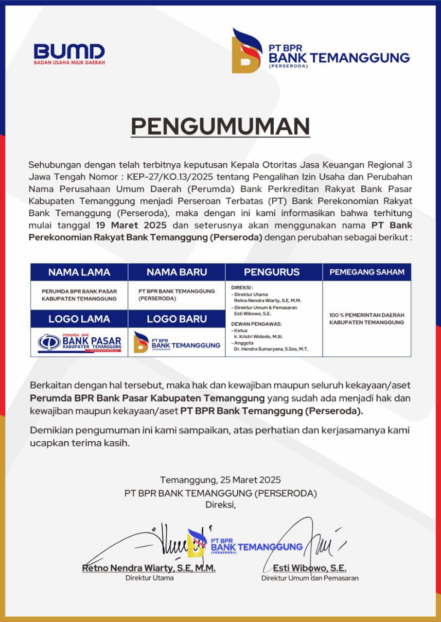Sehubungan dengan telah terbitnya Keputusan Kepala Otoritas Jasa Keuangan Regional 3 Jawa Tengah dan Daerah Istimewa Yogyakarta Nomor KEP-27/KO.13/2025 tentang persetujuan atas Pengalihan Izin Usaha Bank Perkreditan Rakyat (BPR) dari Perumda Bank Perkreditan Rakyat (BPR) Bank Pasar Kabupaten Temanggung kepada PT Bank Perkreditan Rakyat (BPR) Bank Temanggung Perseroda. Dapat di informasikan bahwa mulai tanggal 25 Maret 2025 dan seterusnya akan menggunakan PT BANK PERKREDITAN RAKYAT BANK TEMANGGUNG.