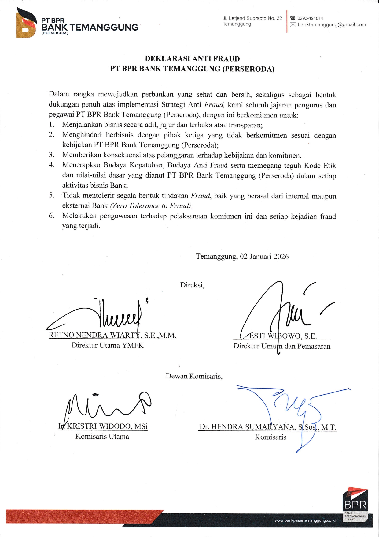 PT BPR Bank Temanggung (Perseroda) berizin dan diawasi oleh Otoritas Jasa Keuangan serta merupakan Peserta Penjaminan LPS